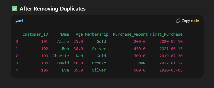 'Purchase_Amount': [200, 450, 300, None, 500, 500], # Missing value in Purchase