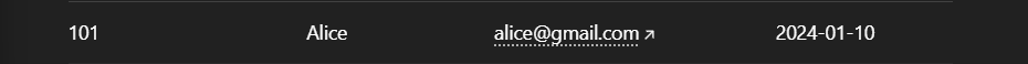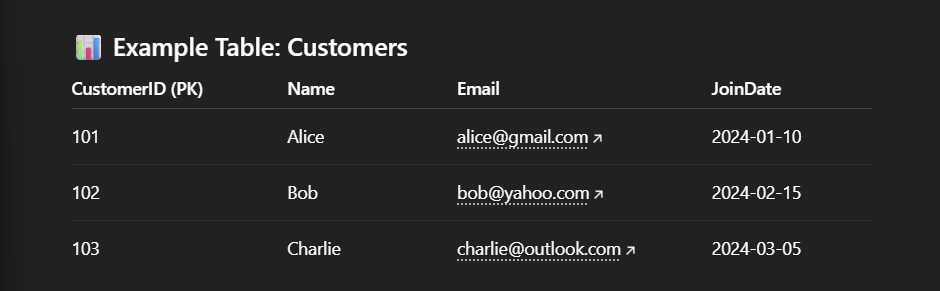 - For example, customer table has a multiple columns like, CustomerID, Name, Email, or JoinDate.