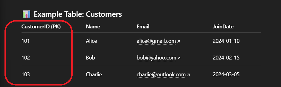 - For example: CustomerID could be the Primary Key because every customer has a unique ID.