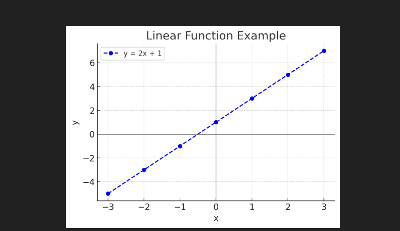 1) Linear Functions: This function represents simple and straight-line relationships between two variables. It is also predicting outcomes with linear regression and quick baseline models because they are easy to interpret.