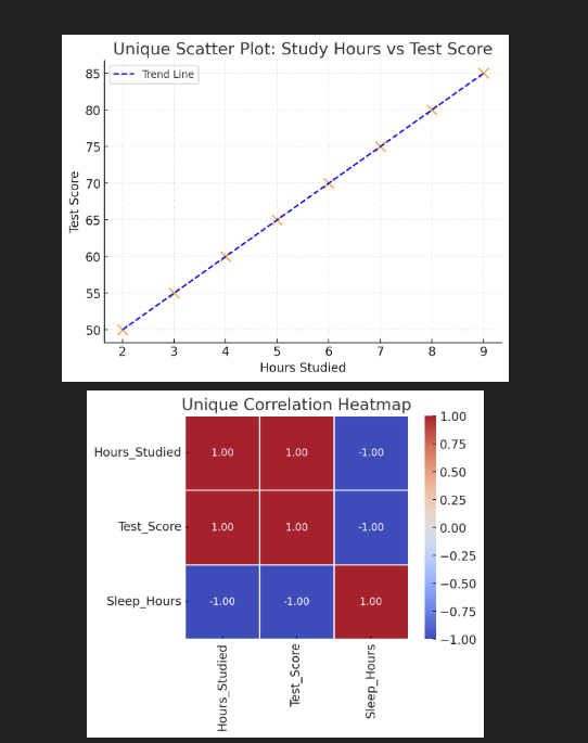 - The Scatter Plot shows how study hours relate to test scores, with a blue dashed trend line added for better understanding.