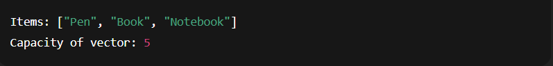 println!("Capacity of vector: {}", items.capacity()); // Output: 5
